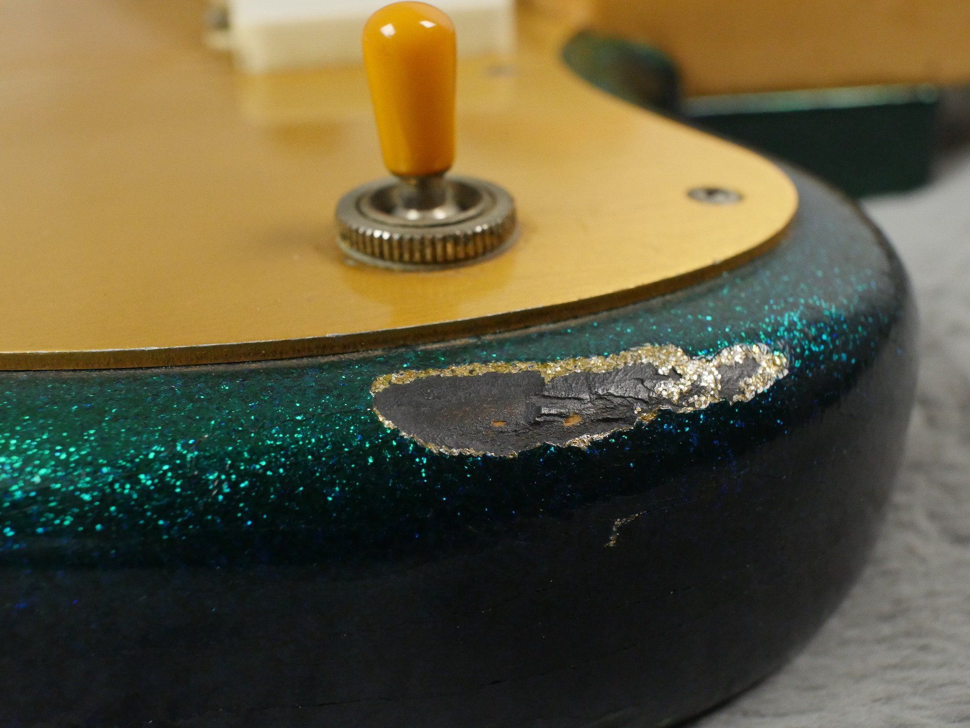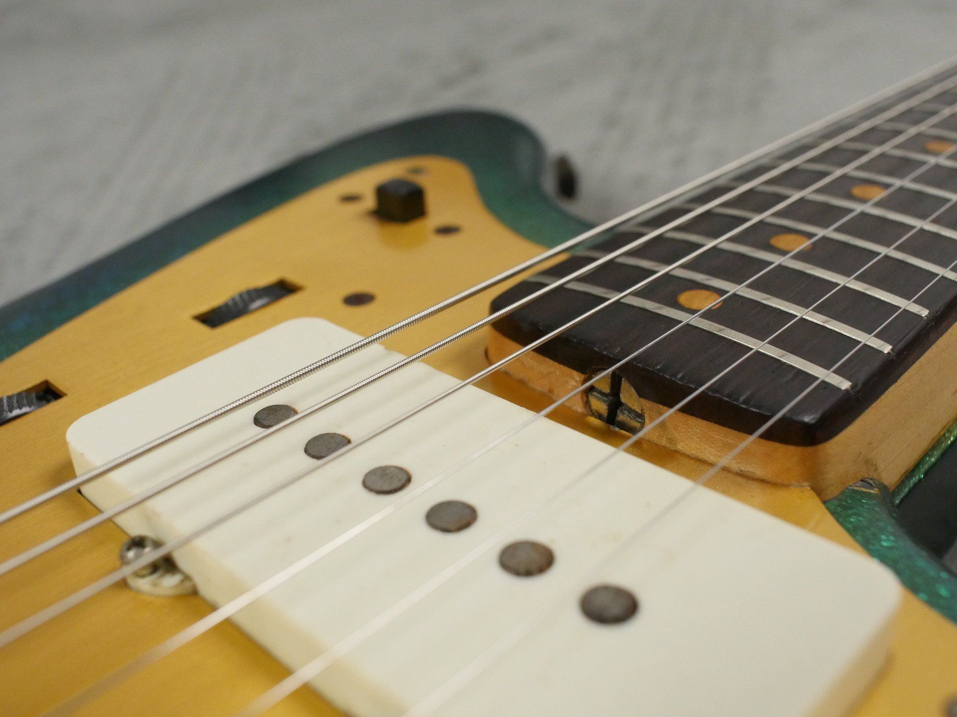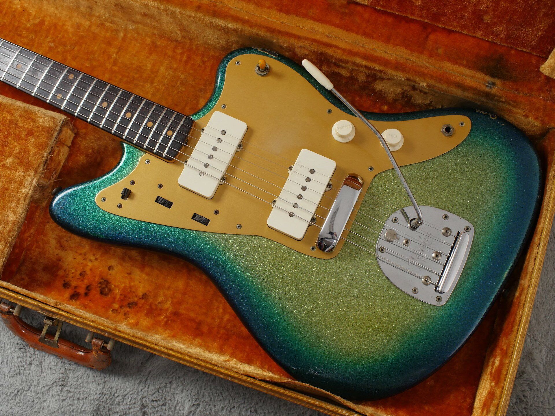 A Fender Jazzmaster from 1958 in a unique sparkle finish ‘surfburst’. This guitar may have been owned and played by the guitarist Nick O’Malley in the seminal surf guitar band the Dick Dale and the Del-Tones of Miserlou fame. Fender didn’t have the skills to laydown these sparkle finishes in those days and this guitar was handed out to a guy called Dennis Swiden who did the best sparkle and pearl finishes back in the day. Either way this is a special guitar and a lovely time capsule of that uniquely west coast cultural era.