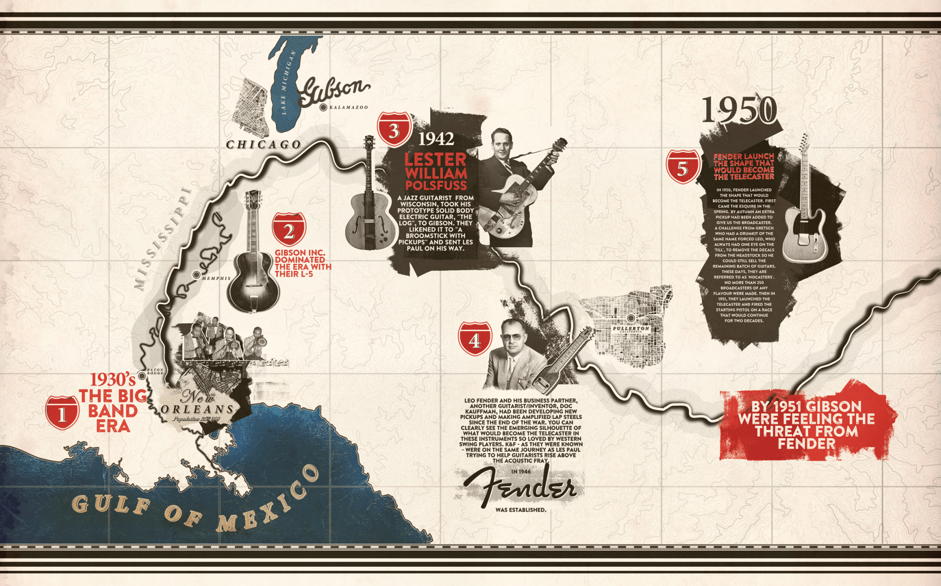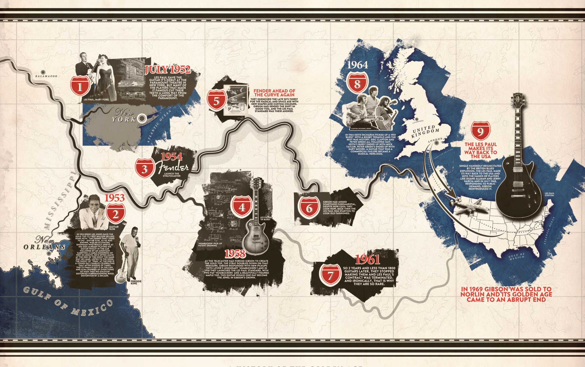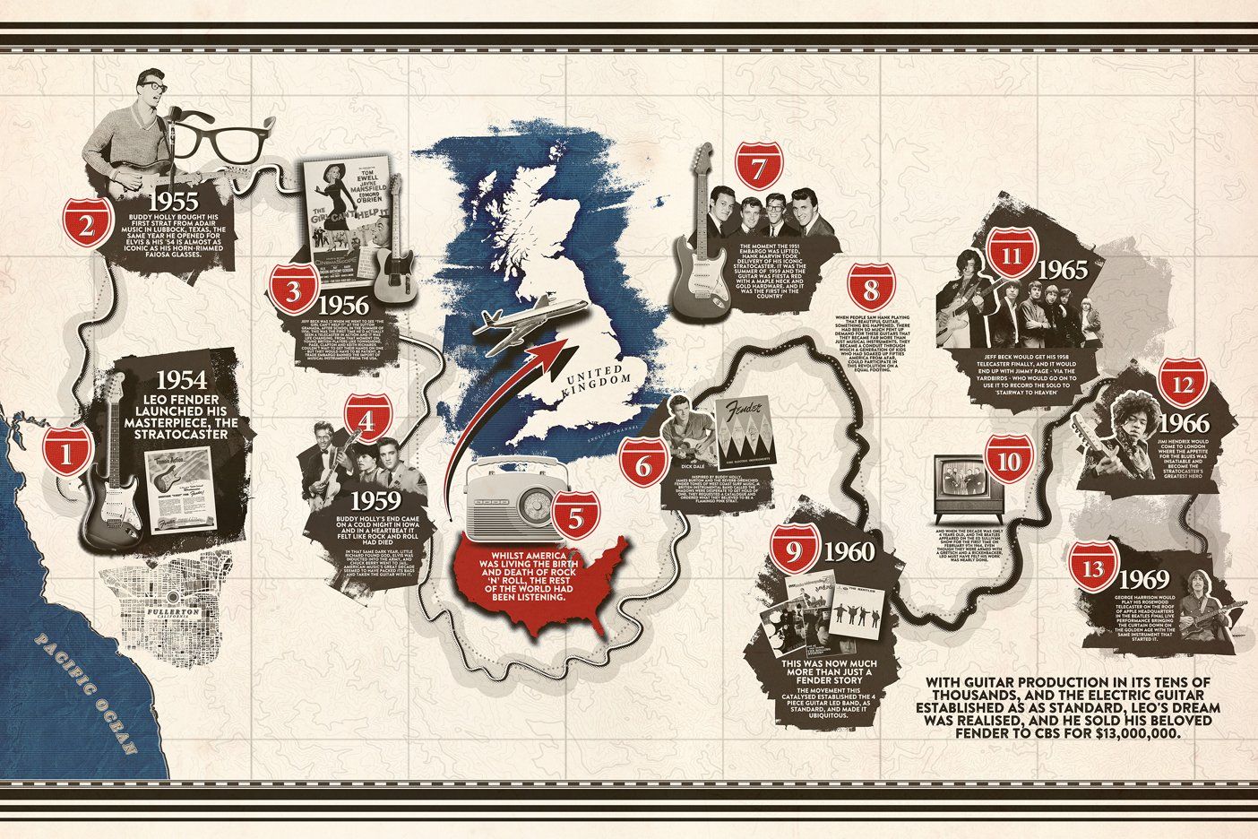 I’d been playing the guitar for many years having been in bands when I was younger, and over the years had started to acquire more guitars than I could practically play. As I mentioned earlier, my focus was very narrow, and I only bought 3 guitar models. I was, am, obsessed by the timelessness of these guitars, their designs impervious to the whim of fashion. If you want to look cool today you pick up a Tele, Les Paul, or a Strat, and that was the same in 1954. And their story, summarised in three maps (shown in the images) I designed for a companion exhibition to the live show, is so fascinating.